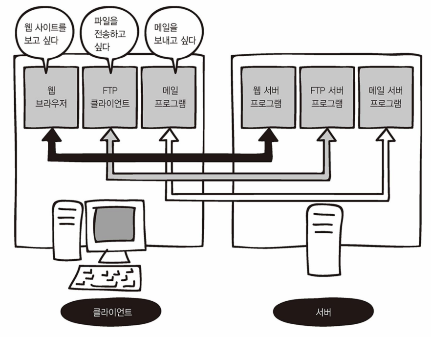 - 서비스를 요청하는 측 ex. 웹 브라우저, 메일 프로그램 등의 애플리케이션
