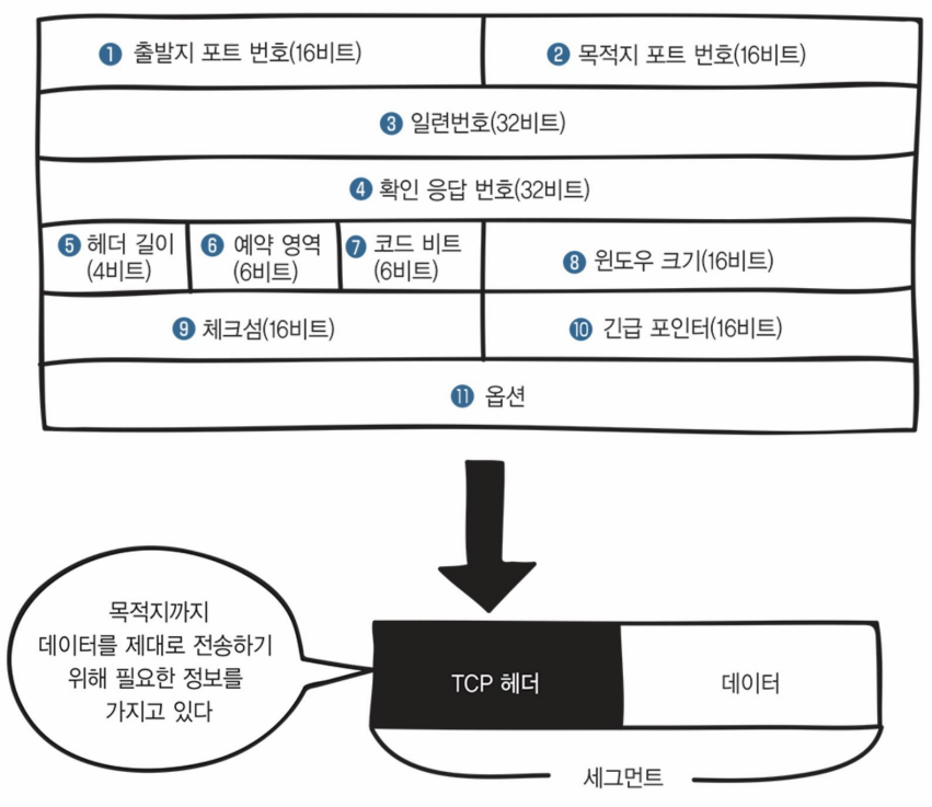 - TCP 헤더 : TCP로 전송할 때 붙이는 헤더