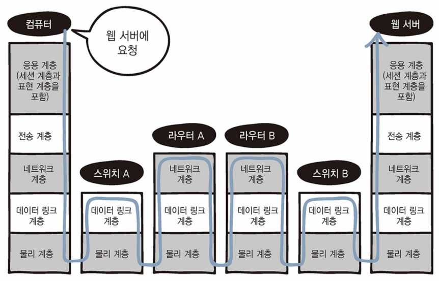 - (A 컴퓨터) 물리 계층 -> 데이터 링크 계층 -> (B 컴퓨터)물리 계층으로 데이터 전달