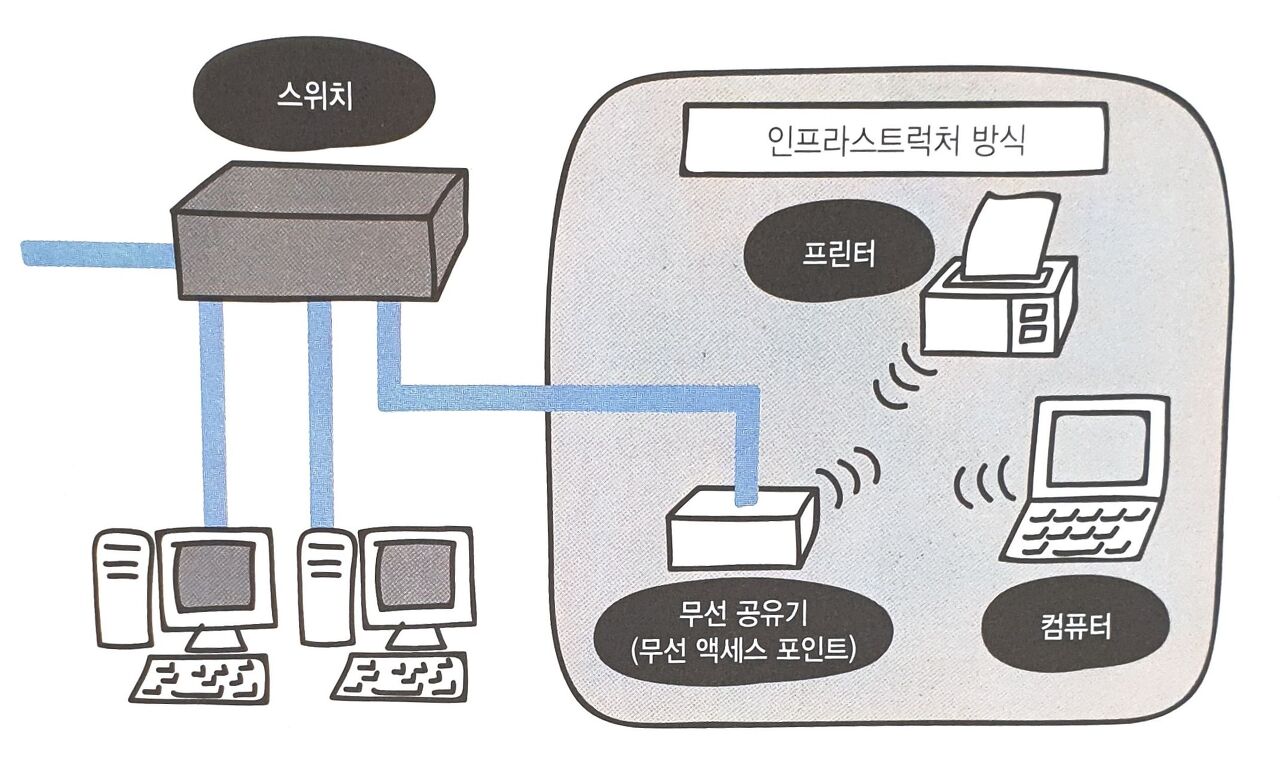 - 무선 공유기(무선 액세스 포인트)를 중심으로 기기들이 접속하는 방식