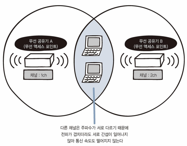 - 전파가 겹치는데 채널도 같으면 전파 간섭 발생