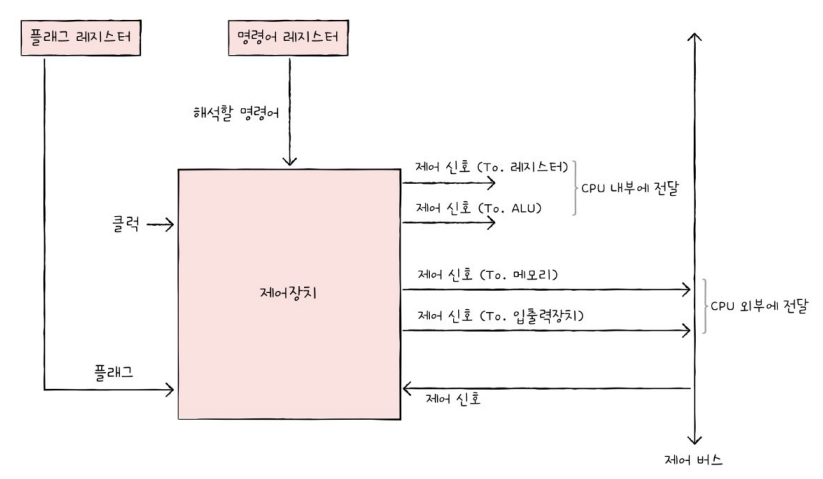 - 제어장치 : 제어 신호를 내보내고, 명령어를 해석하는 부품