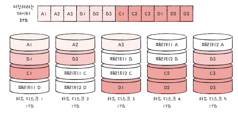 - 단점 : 패리티가 두 개라서 쓰기 속도는 좀 느림