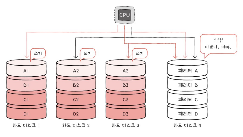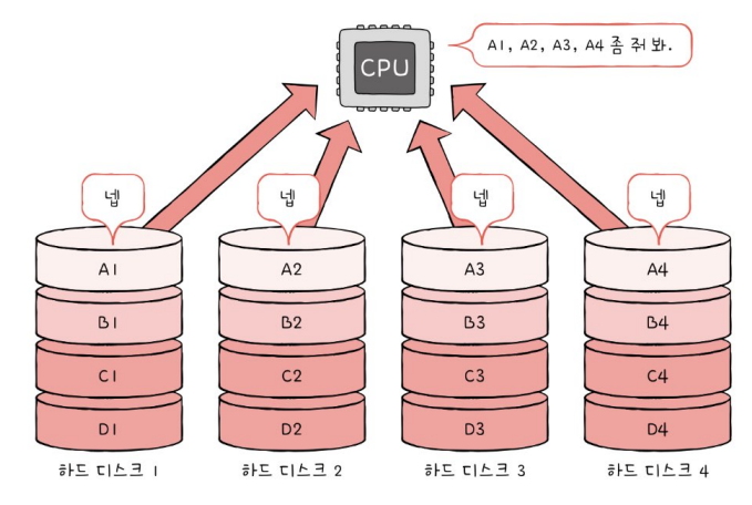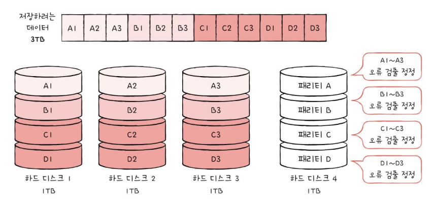 - 스트라입 stripe : 줄무늬처럼 분산되어 저장된 데이터