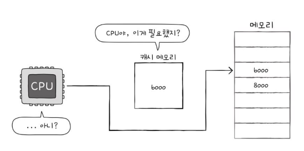 - 캐시 미스 cache miss : 캐시 메모리에 저장했지만 예측이 틀려 CPU가 메모리에서 필요한 데이터를 가져오는 경우