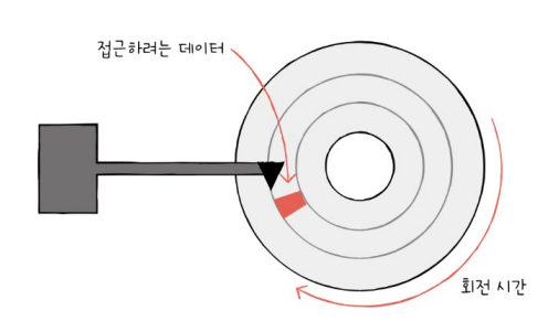 - 회전 지연 rotational latency : 헤드가 있는 곳으로 플래터를 회전시키는 시간
