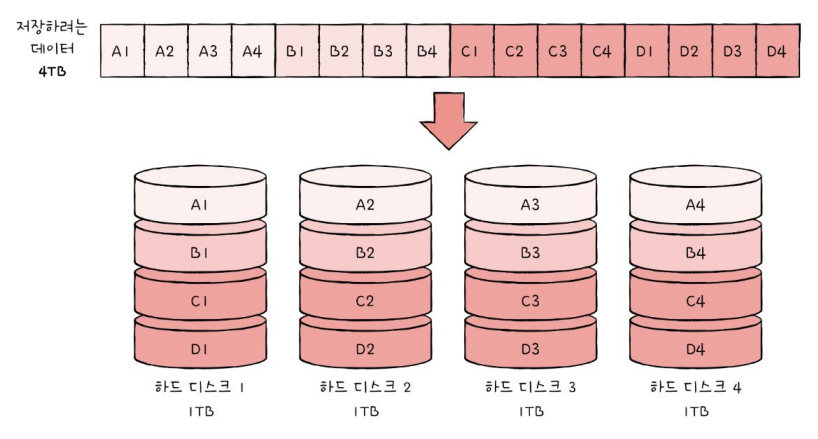 - 스트라이핑 striping : 분산하여 저장하는 방식
