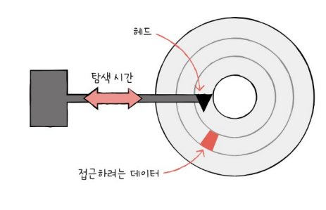 - 탐색 시간 seek time : 데이터가 저장된 트랙까지 헤드를 이동시키는 시간