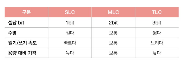 - QLC quadruple level cell : 한 셀에 4bit 저장(책에선 다루지 않음)