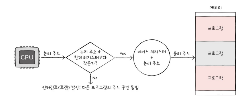 - 논리 주소 범위를 벗어나는 명령어 실행을 방지, 실행 중인 프로그램이 다른 프로그램에 영향을 받지 않도록 보호하는 역할
