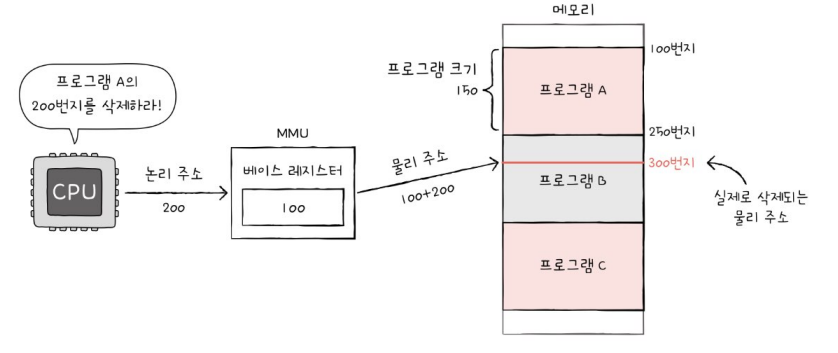 - 논리 주소와 물리 주소 간의 변환 담당 -> CPU가 발생시킨 논리 주소 값 + 베이스 레지스터* 값