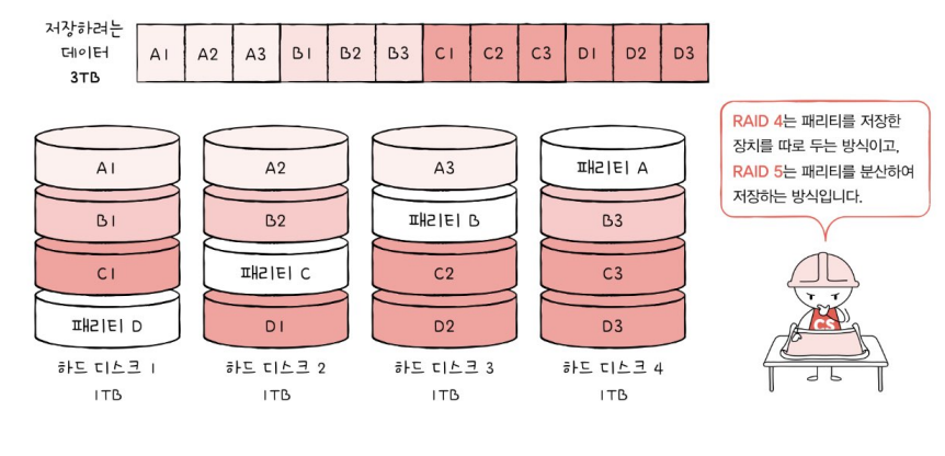 - 다른 장치들의 오류를 검출, 복구하기 때문에 RAID 1보다 적은 하드 디스크를 요구