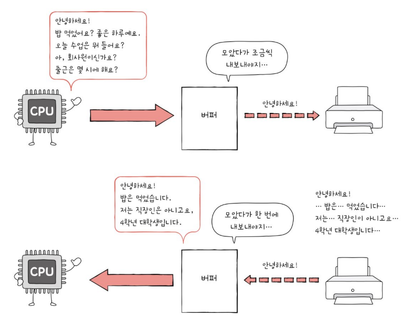 -> 데이터를 버퍼에 조금씩 모았다가 한꺼번에 내보내거나, 데이터를 한 번에 많이 받아 조금씩 내보내는 방법