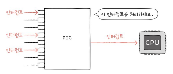 - PIC : 여러 장치 컨트롤러에 연결되어, 장치 컨트롤러에서 보낸 하드웨어 인터럽트 요청들의 우선순위를 판별한 뒤 CPU에 지금 처리해야 할 하드웨어 인터럽트를 알려주는 장치