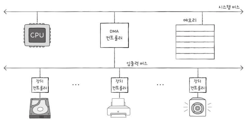 - DMA : 입출력장치와 메모리가 CPU를 거치지 않고도 상호작용할 수 있는 입출력 방식 = 메모리에 직접 접근할 수 있는 입출력 기능