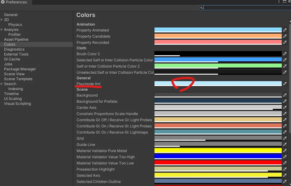 Edit → Preferences → Colors → Playmode tint 수정하면 재생할 때 강조할 수 있어 쉽게 구분 가능