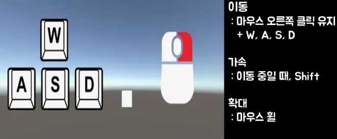 오른쪽 마우스 + 마우스 휠 : 카메라 이동 속도 조절
