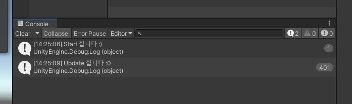 js의 console.log처럼 Debug.log를 사용하면 되는데 세 종류가 있음