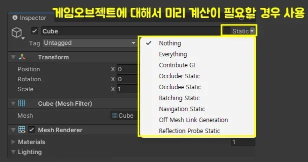 계산을 하기 위해 미리 “움직이지 않는 게임 오브젝트”로 설정해두는 것