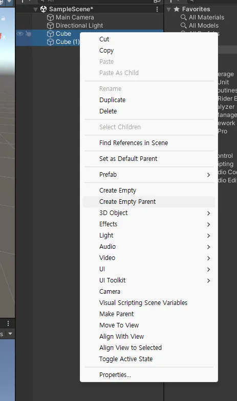 그룹화 할 항목 선택 후 Create Empty Parent 클릭