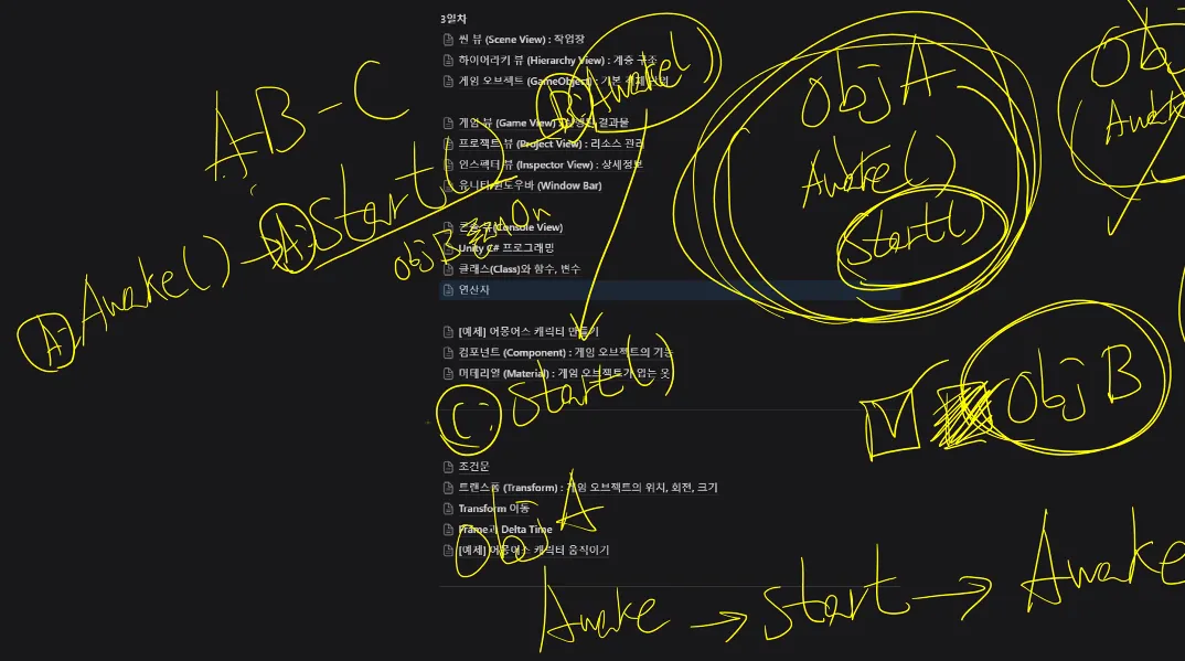 ObjA, ObjB, ObjC에 모두 awake가 있고, ObjA에는 start가 있을 때