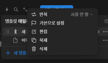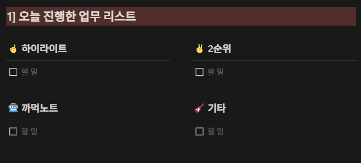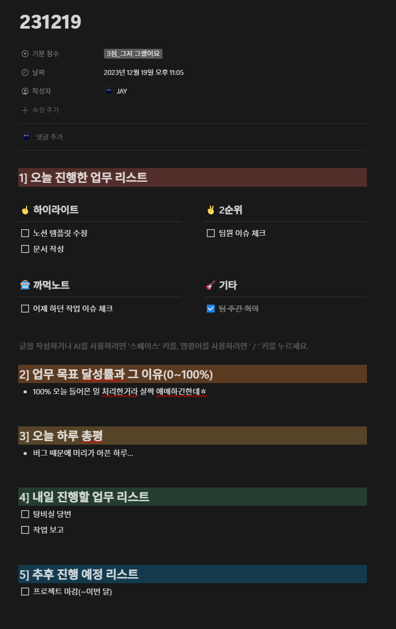 노션의 템플릿 반복 기능을 사용하여 매일 개인 회고용이자 업무일지로 사용하였습니다.