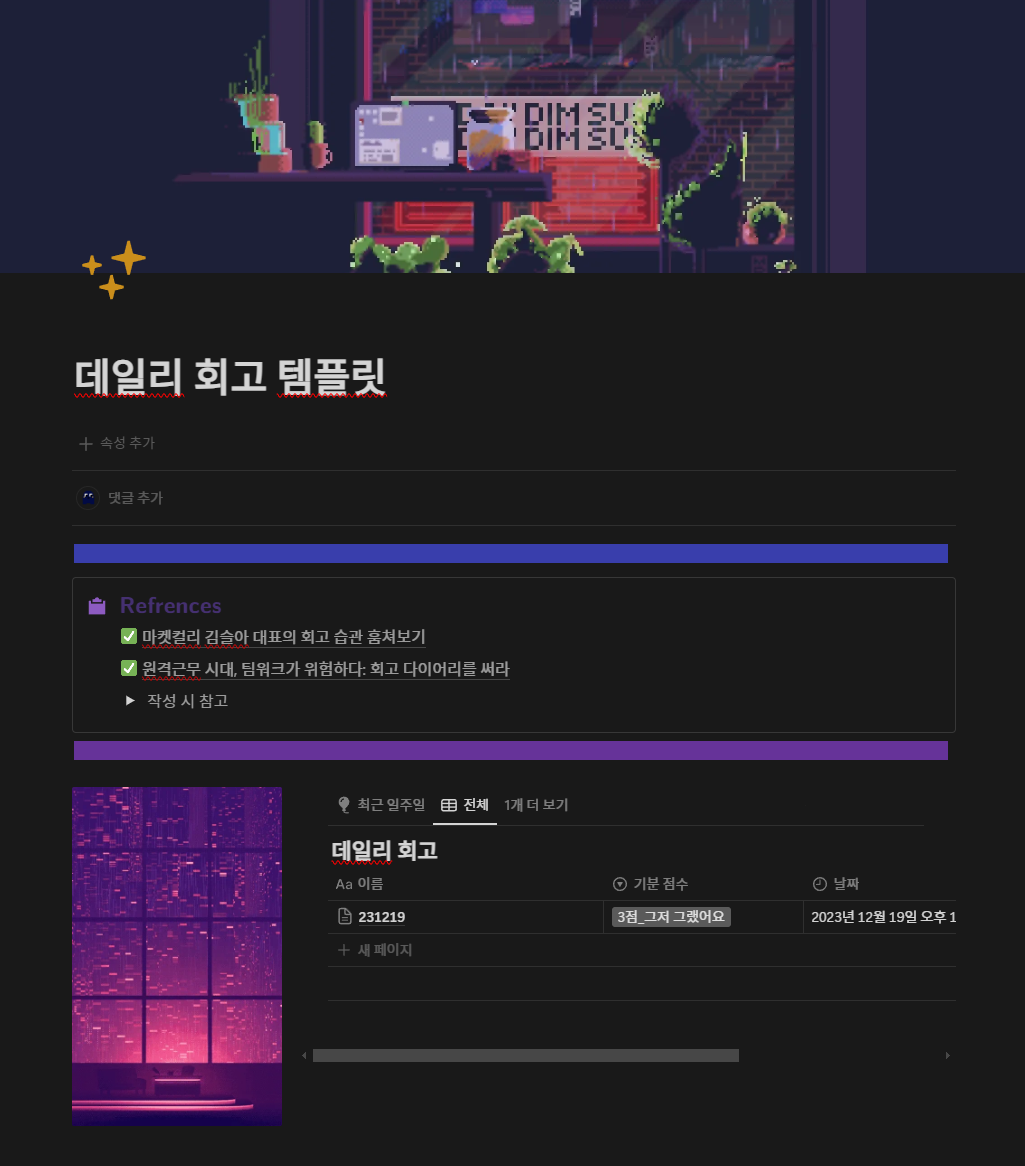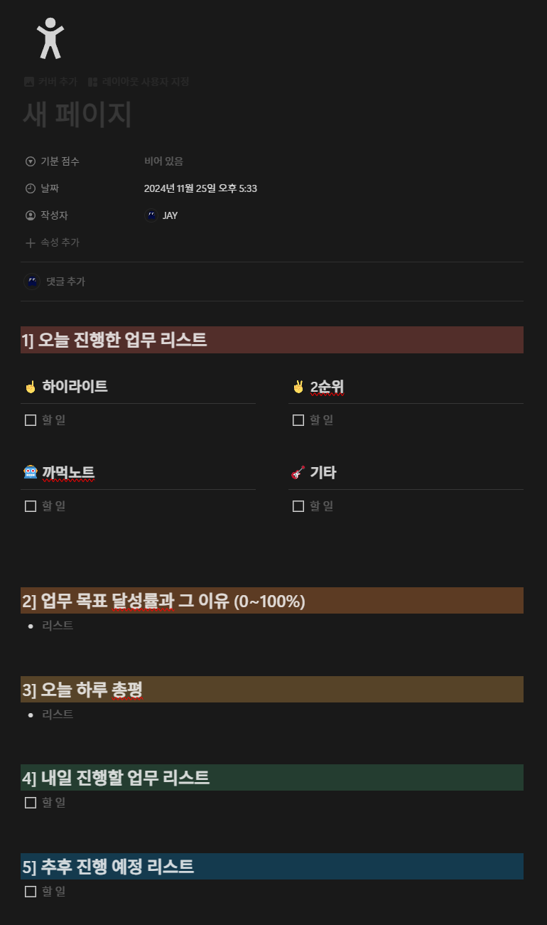 예전에 해당 글을 읽고 혼자 데일리 회고 템플릿을 고민하다 만든 템플릿입니다.