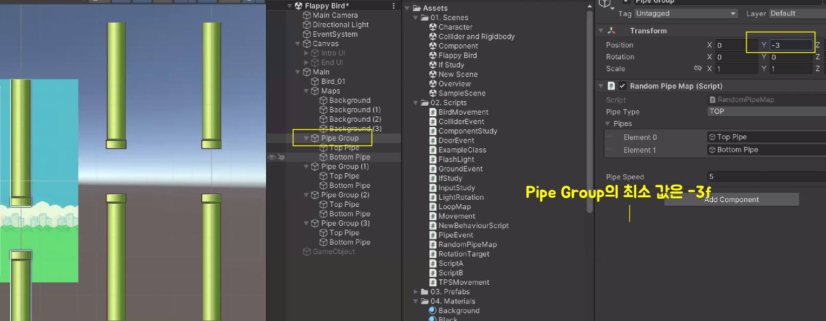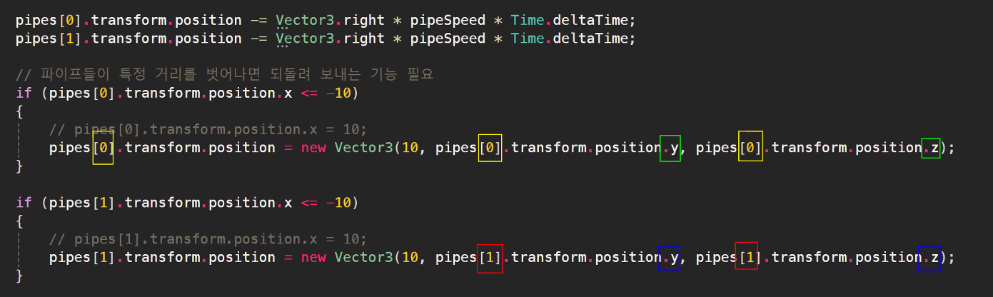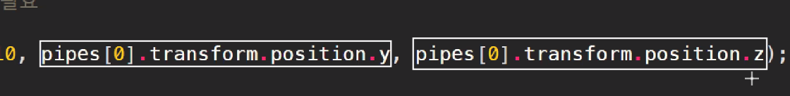 pipe(GameObject)의 transform의 position이 3차원이라 Vector3 반영