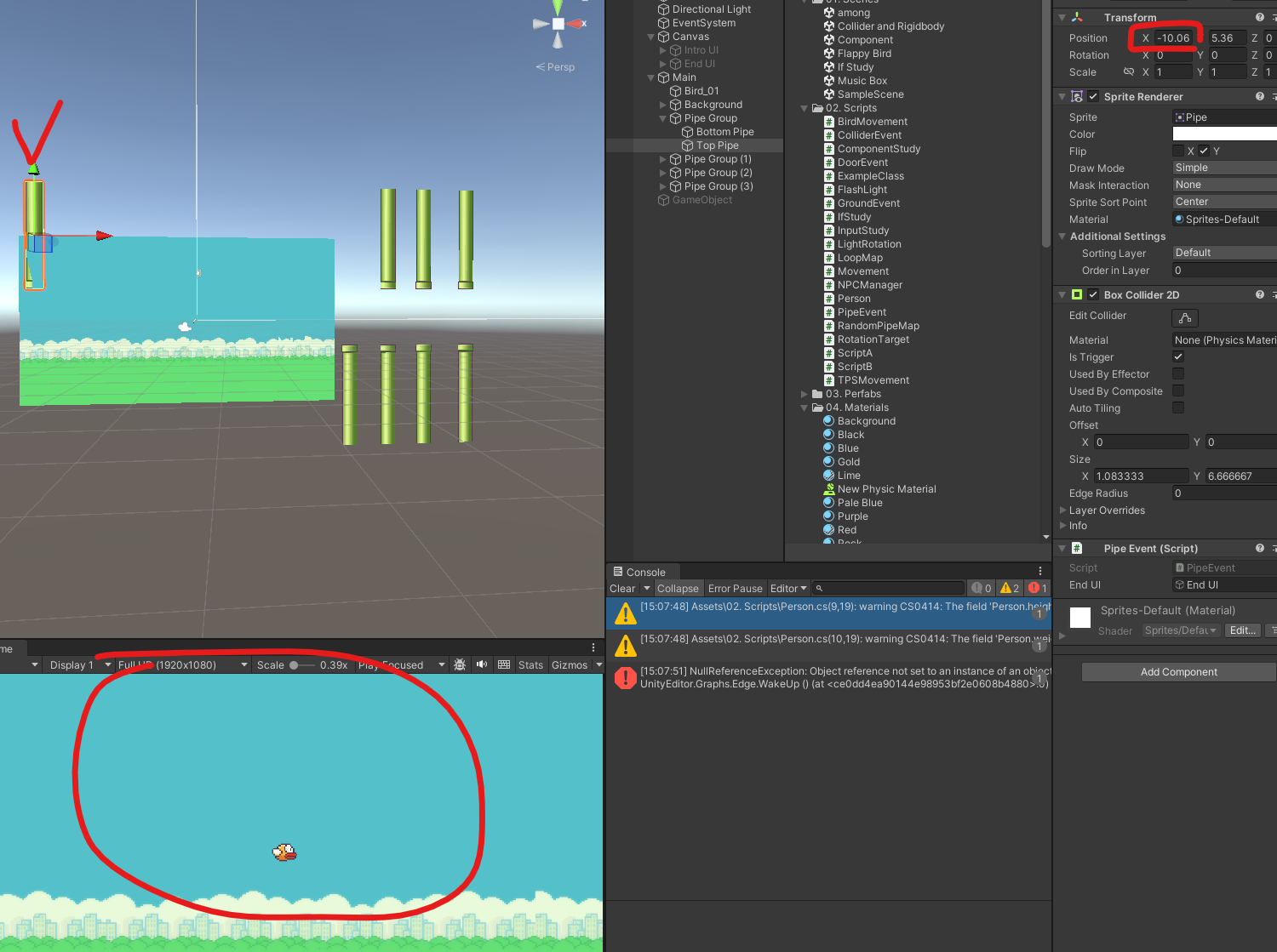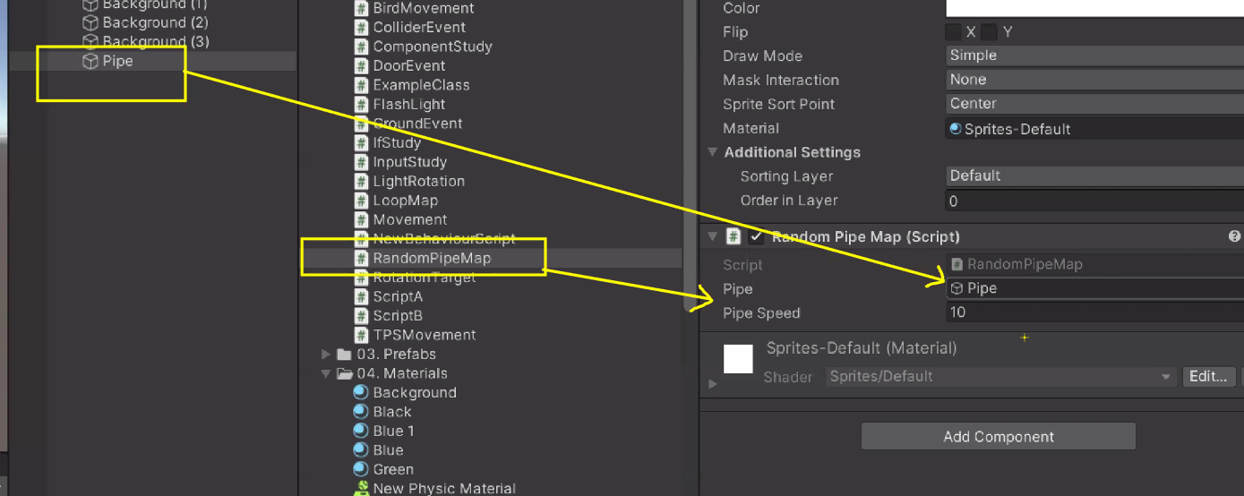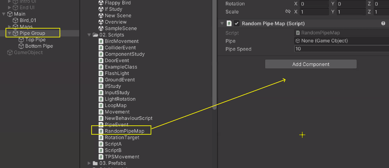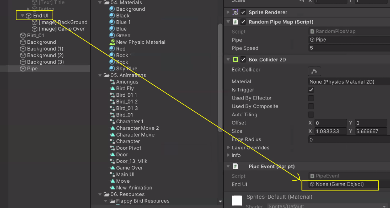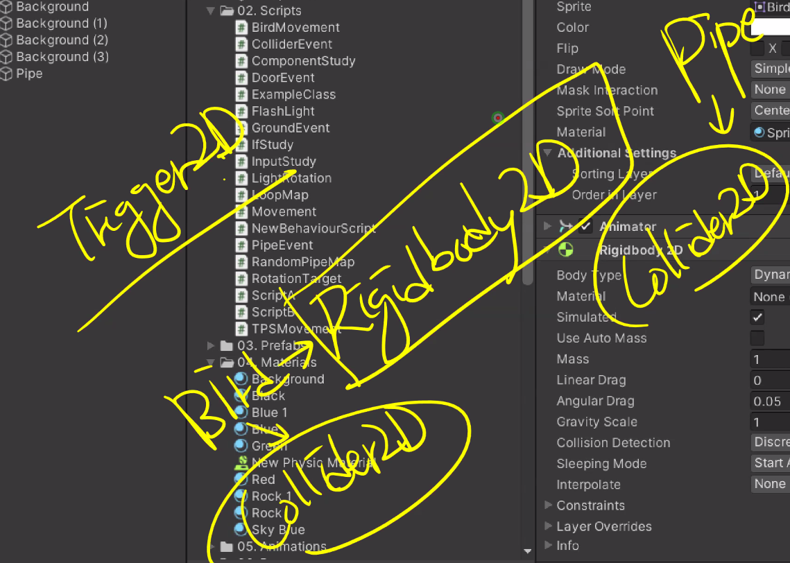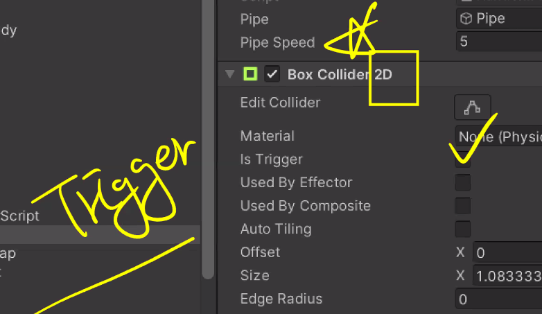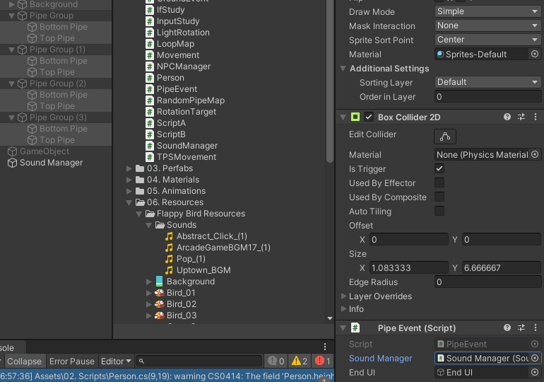 이제 Bird와 Pipe에 각각 Collider2D 필요