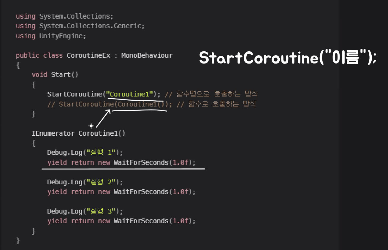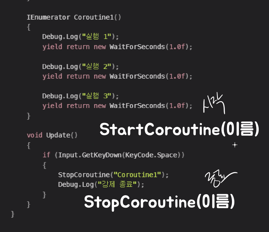 StartCoroutine("이름");으로 시작, StopCouroutine으로 종료