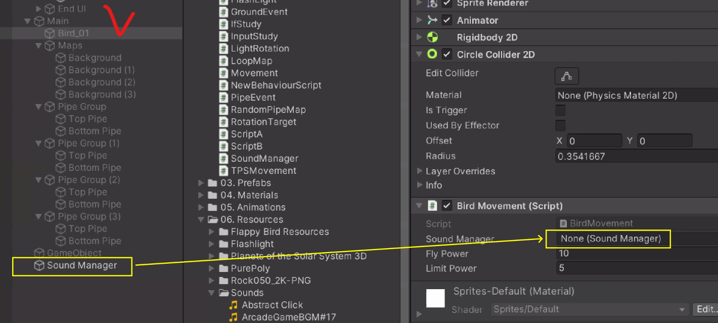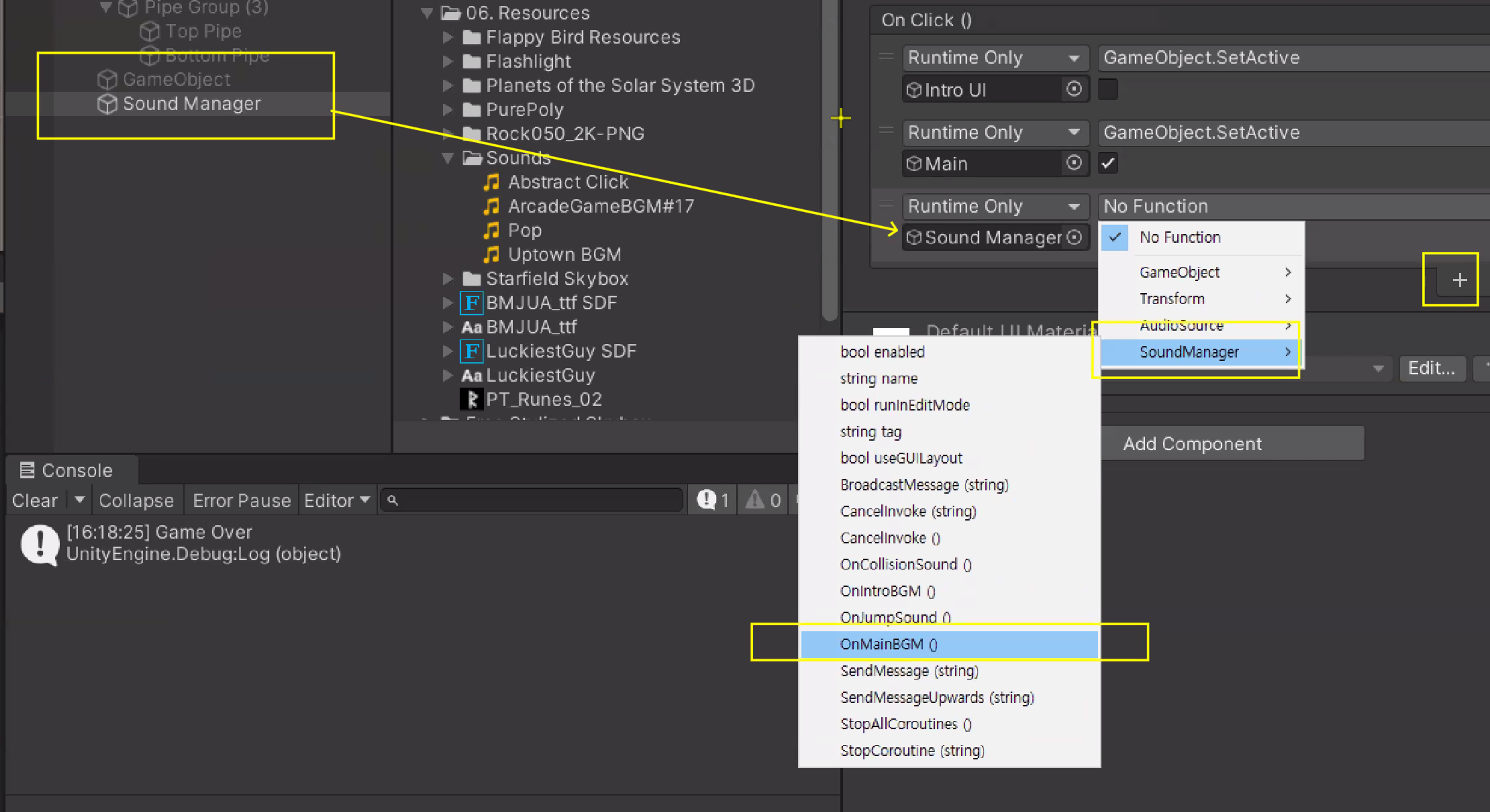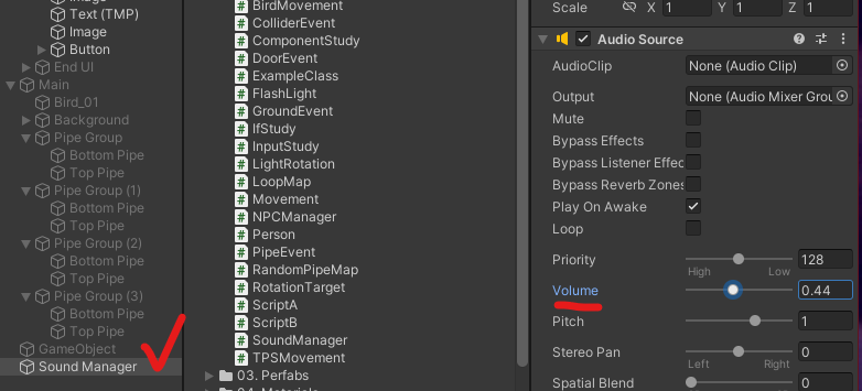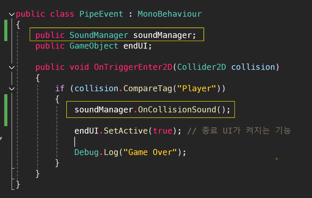Pipe에 부딪혔을 때 Sound 넣어주기(위와 동일)
