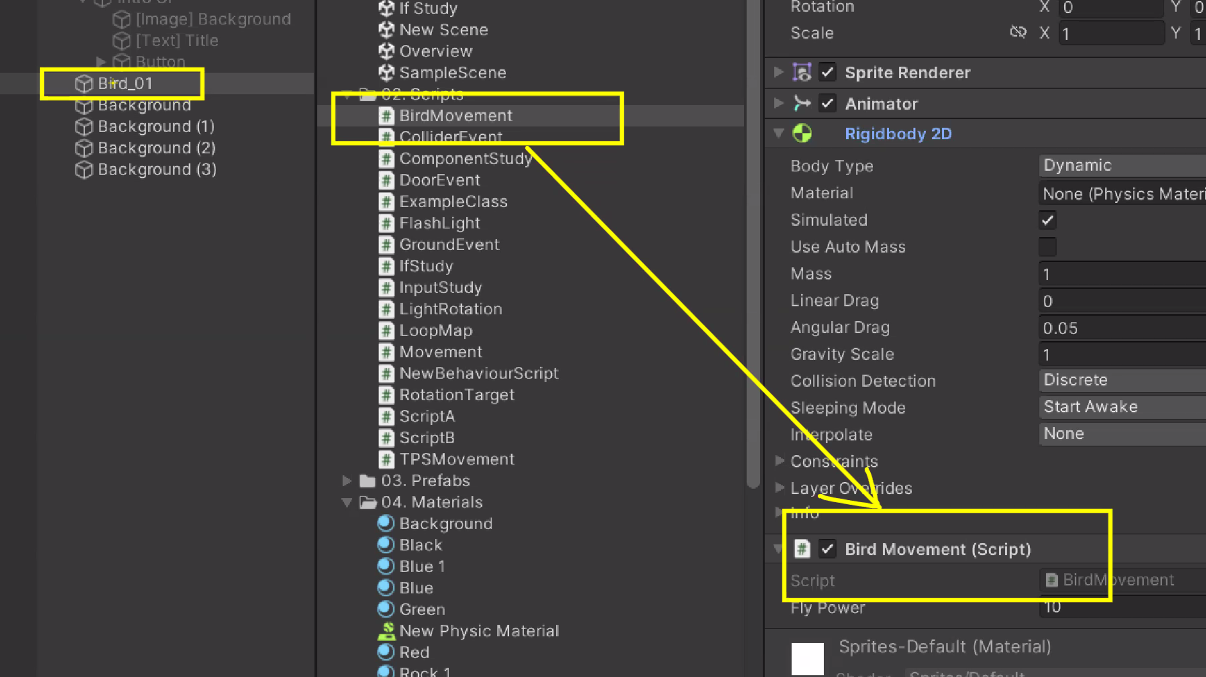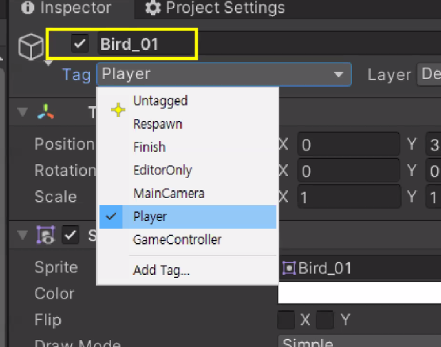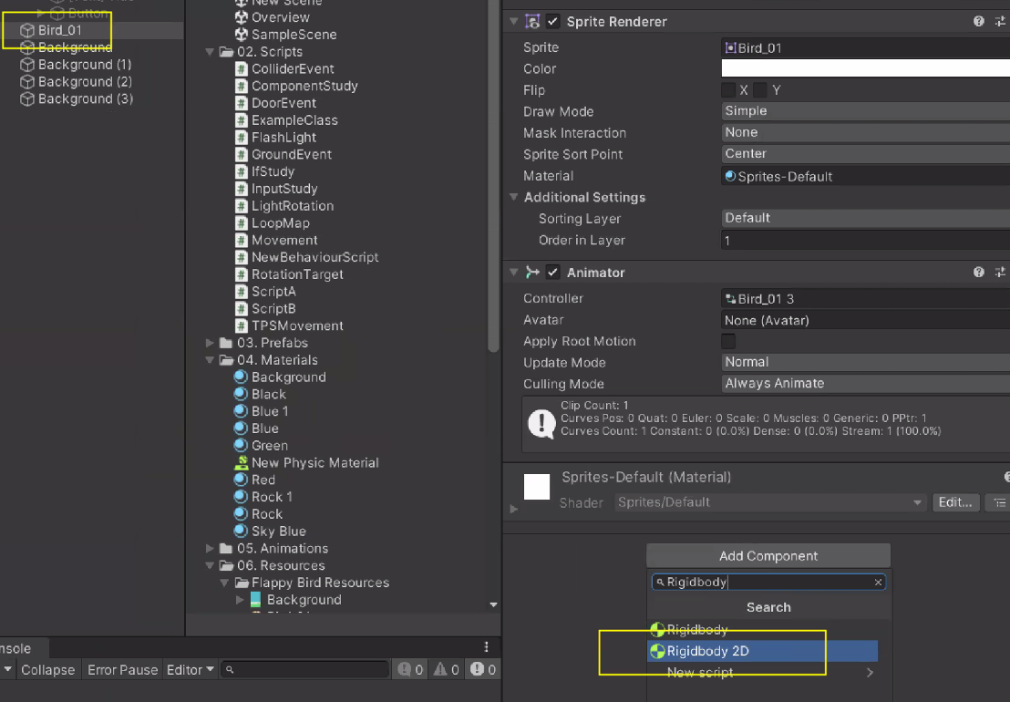 Bird 01에 Rigidbody 2D 넣기