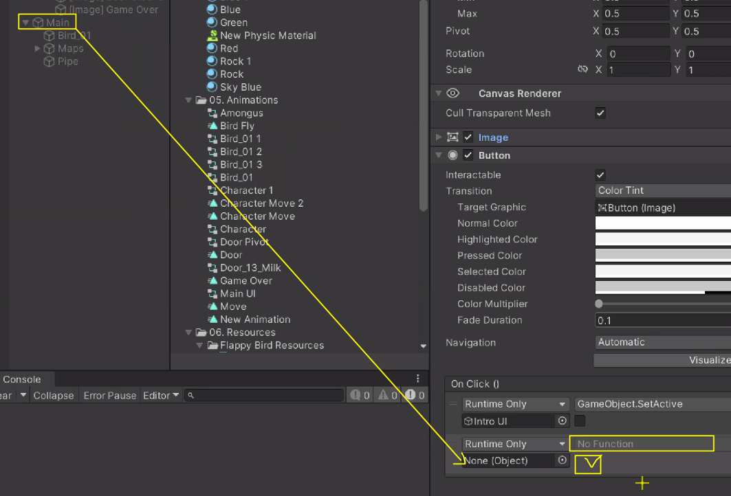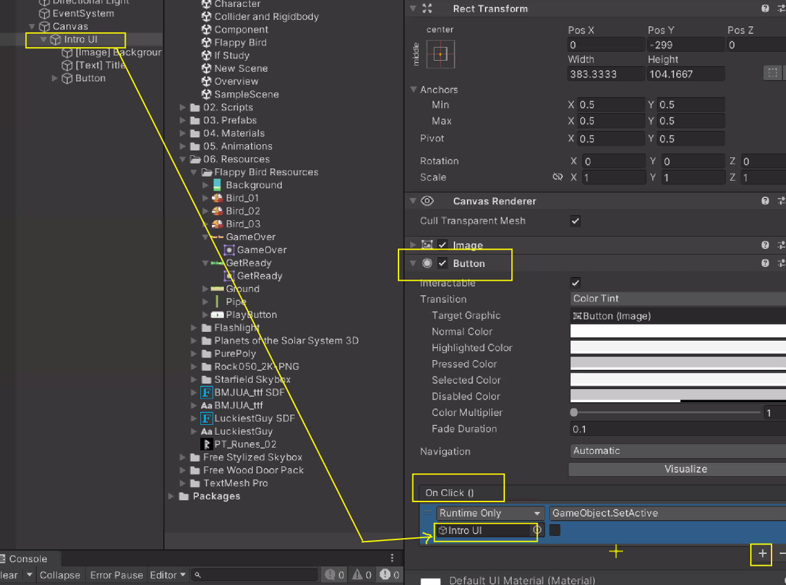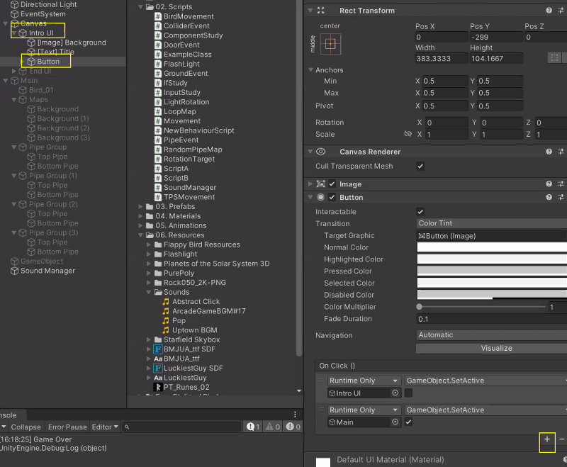 Button 누르면 화면 꺼지도록 OnClick()에 Intro UI / GameObject - SetActive 설정