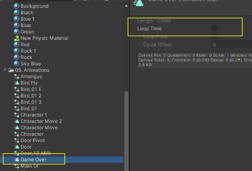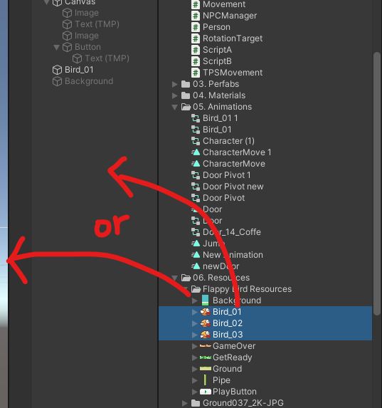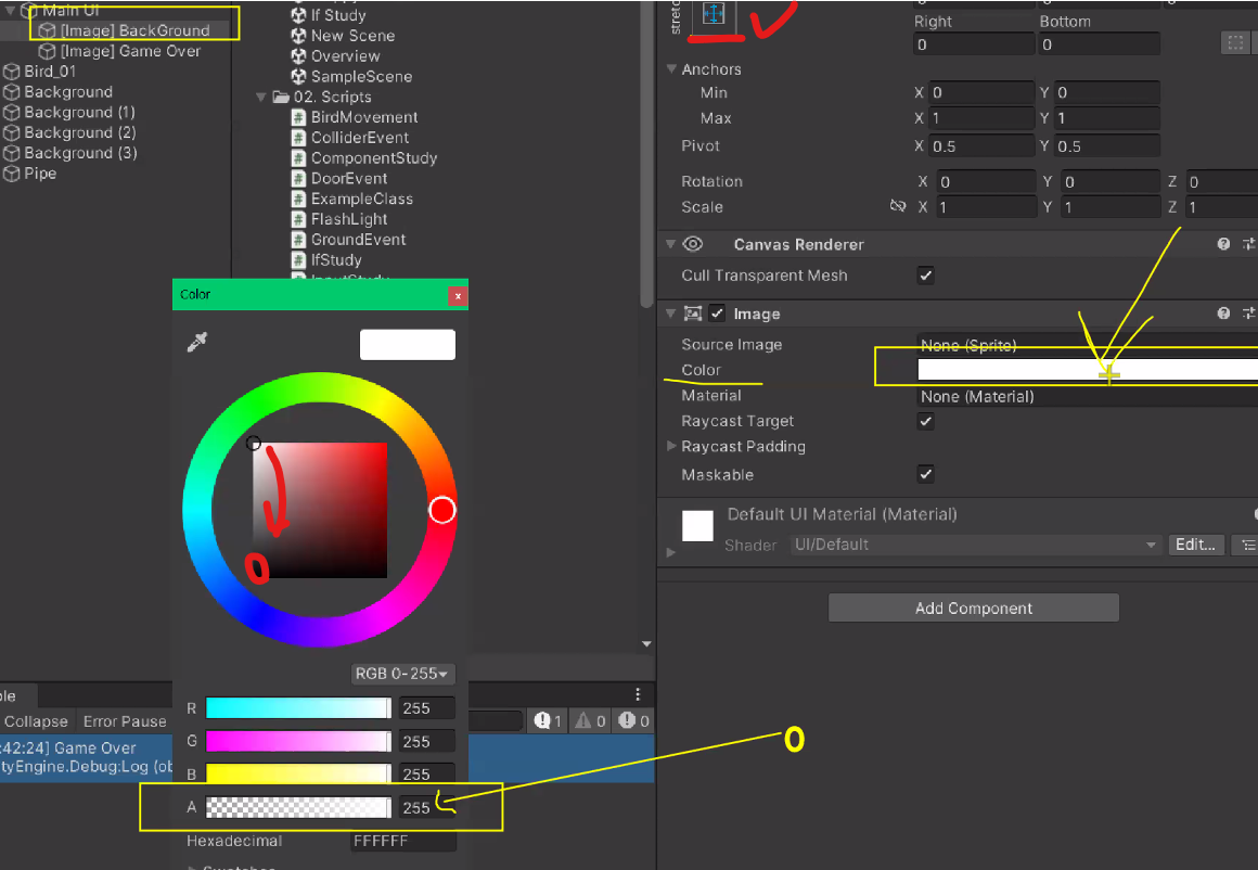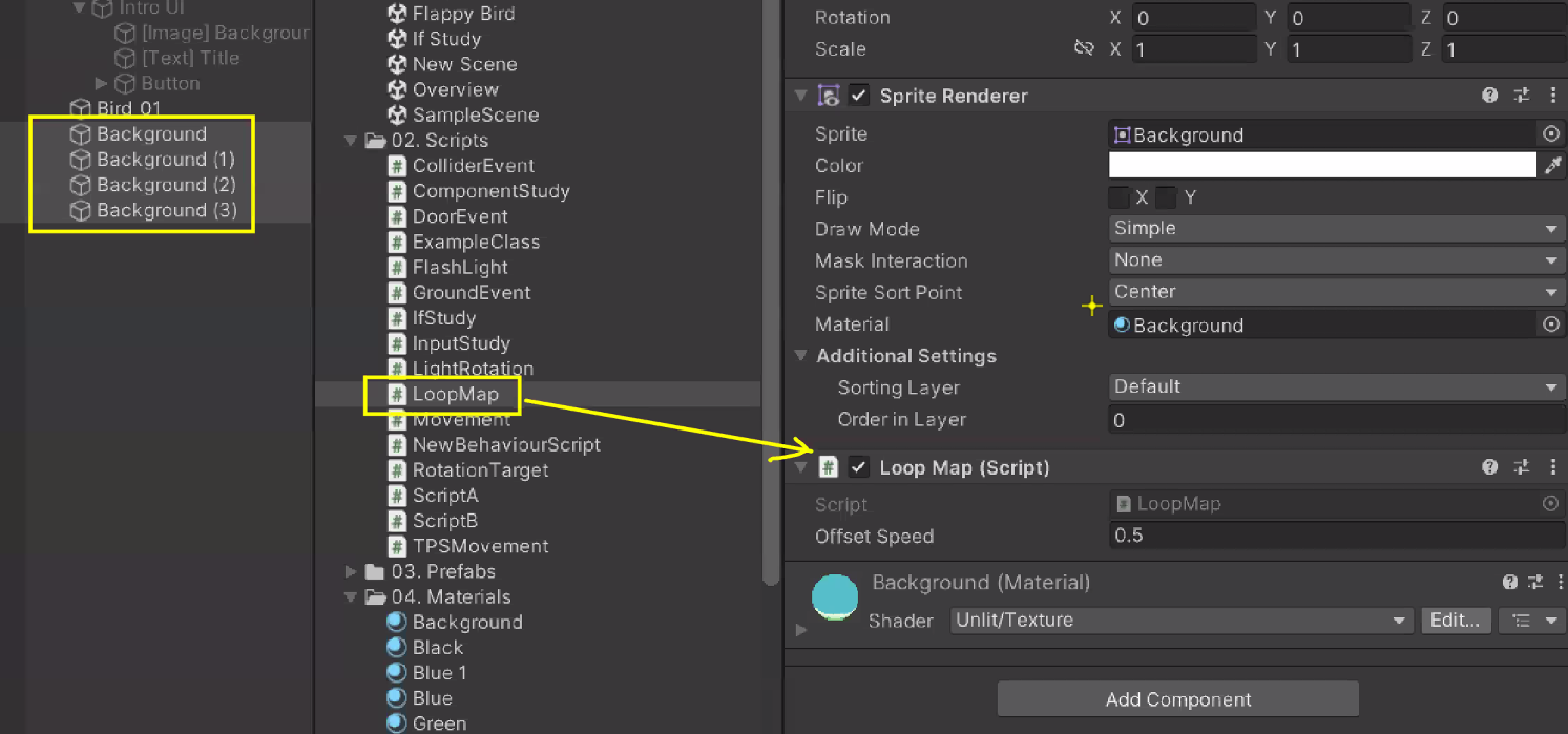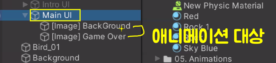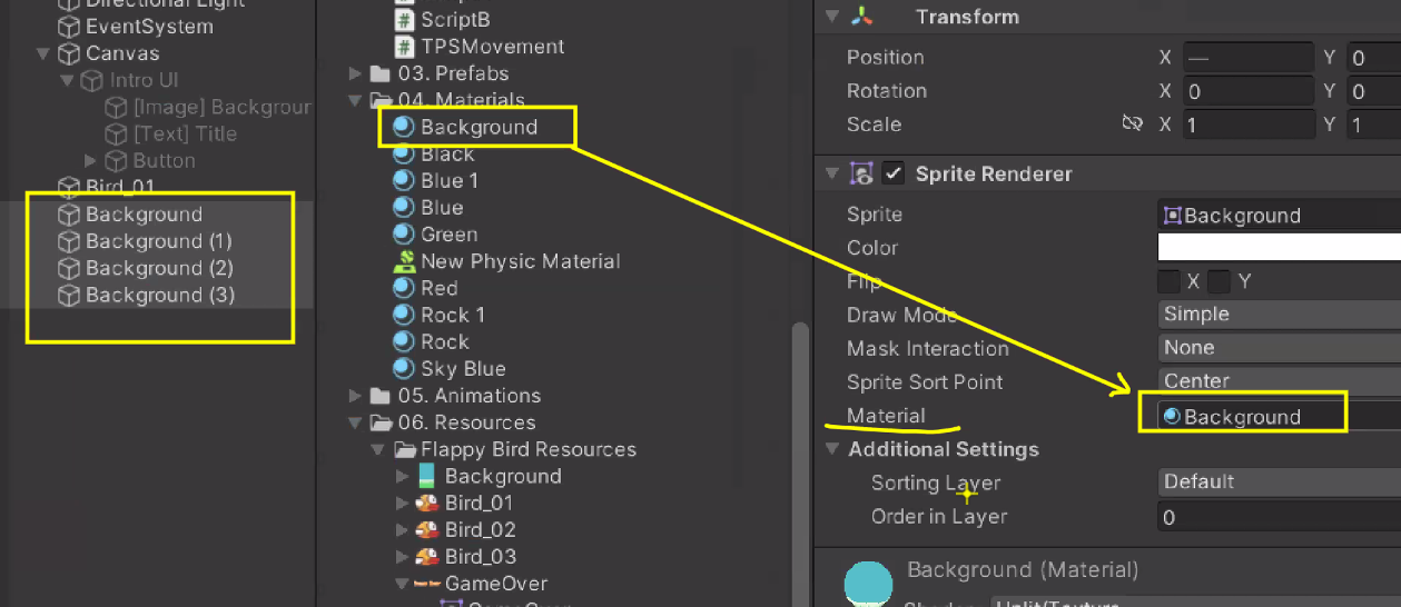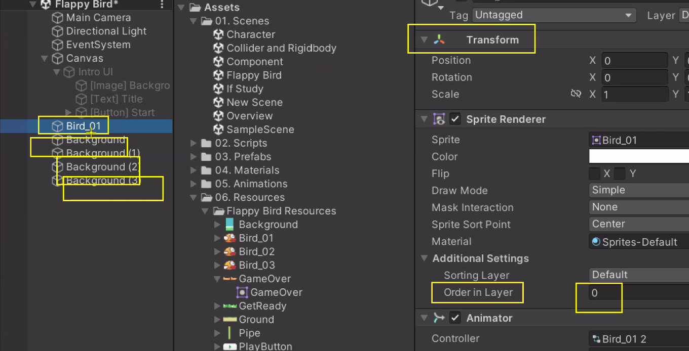 새의 Order in Layer를 1로 바꿔주면 배경 이미지에 가려져있던 게 보임