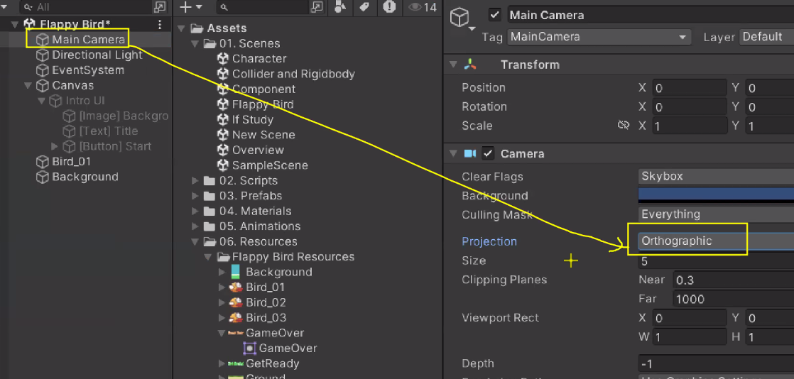 2D 게임을 위한 원근감 없는 카메라로 변경