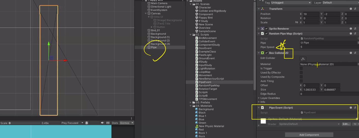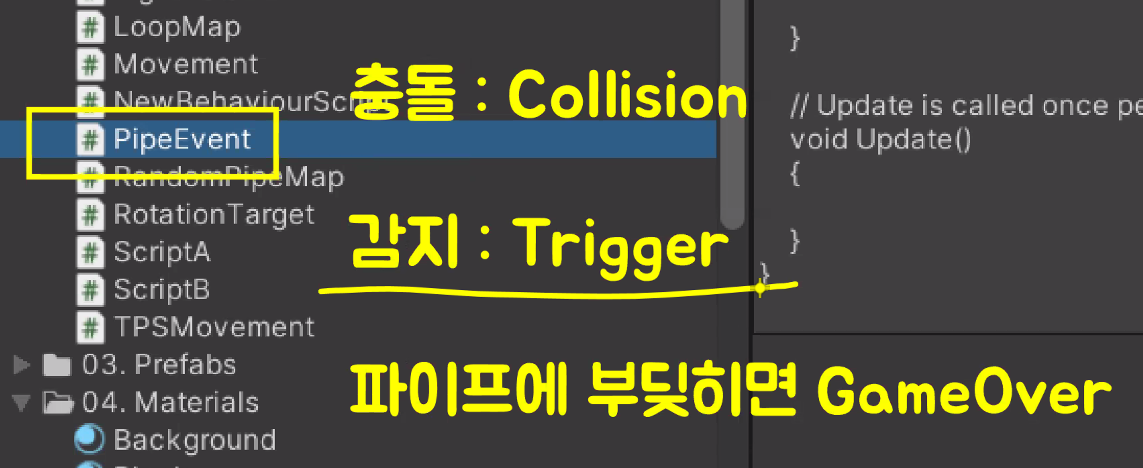 아직 파이프랑 충돌 이벤트는 없지만...한번 피해봄