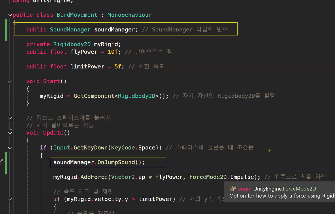 if (myRigid.velocity.y > limitPower) // 새의 y축 속도가 제한 속도보다 커졌을 때