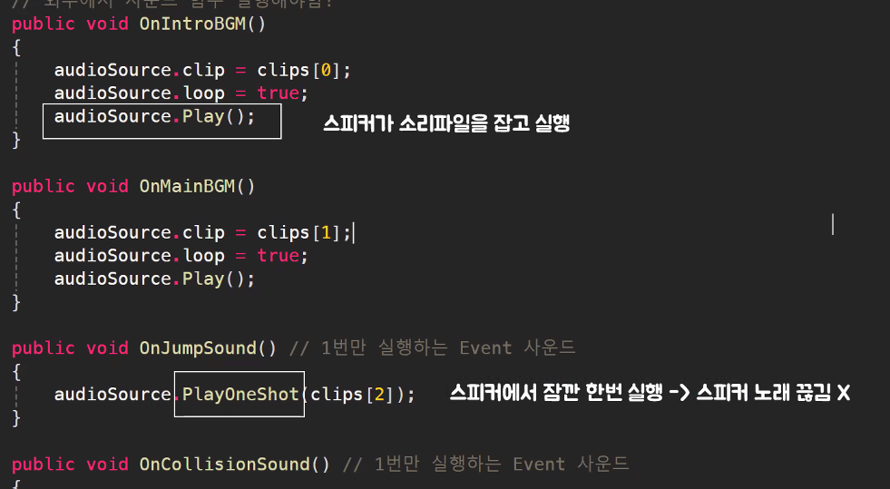-> Intro랑 중복으로 나오는 거 아니야? : 스피커는 한개 뿐이라 .Play로 실행한 소리는 한번에 하나 재생됨