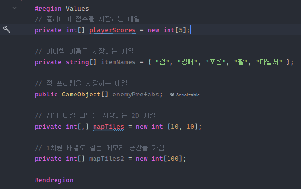 private string[] itemNames = { "검", "방패", "포션", "활", "마법서" };