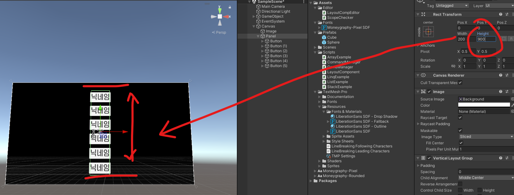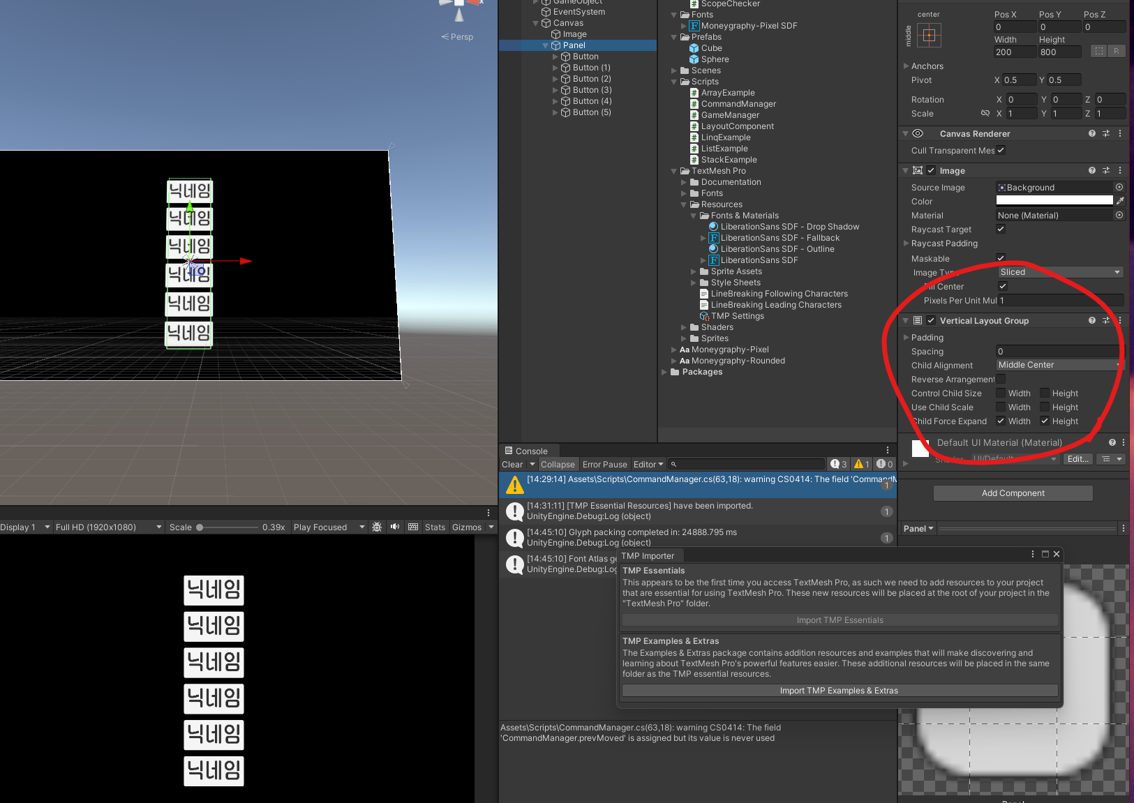 Panel에 Vertical Layout Group 넣고 Middle Center로 설정해준 뒤, 사이즈 조정하고 버튼 복제 => 정렬됨