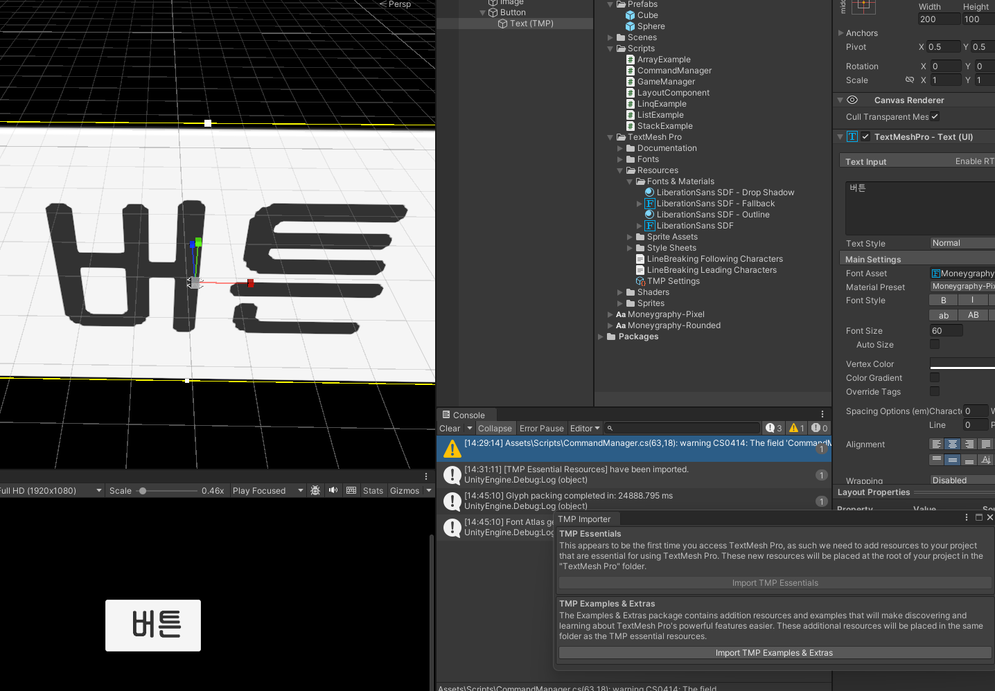 UGUI 한글 입력 문제를 해결하기위해 TextMeshPro로 텍스트를 변경하고 한글을 입력했더니 한글이 안나오는 이슈가 있었다. 이유는 셋팅된 폰트에 한글이 없기 때문이었고, 한글폰트를 추가해주기