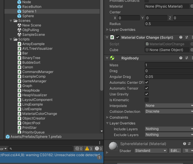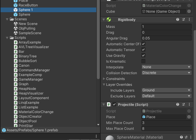 Sphere의 Rigidbody-LayerOvverides에 Include Layers에 Ground 적용