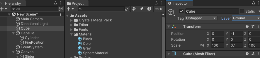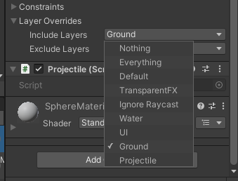 Cube에 Ground 레이어, Sphere(Prefab)에 Projectile 레이어 적용