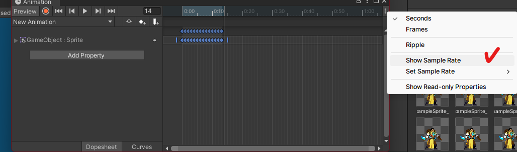 1초당 재생할 애니메이션 프레임 수 수정을 위해 Show Sample Rate해서 수정