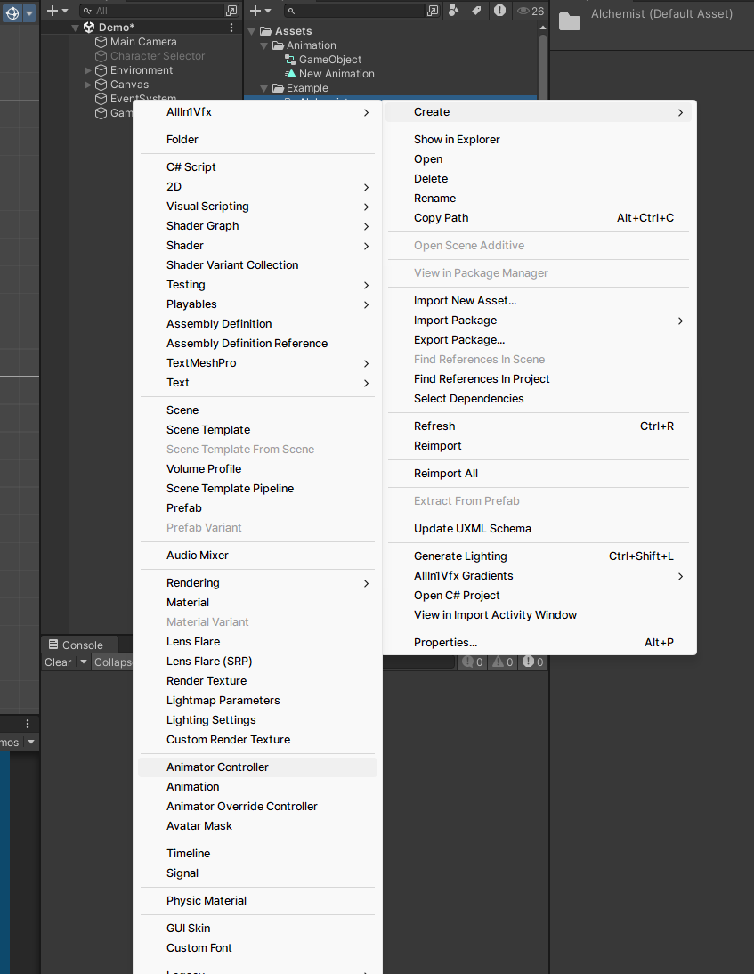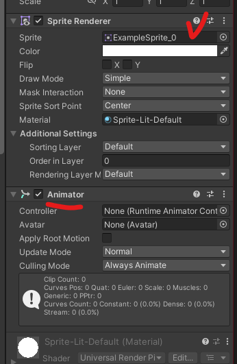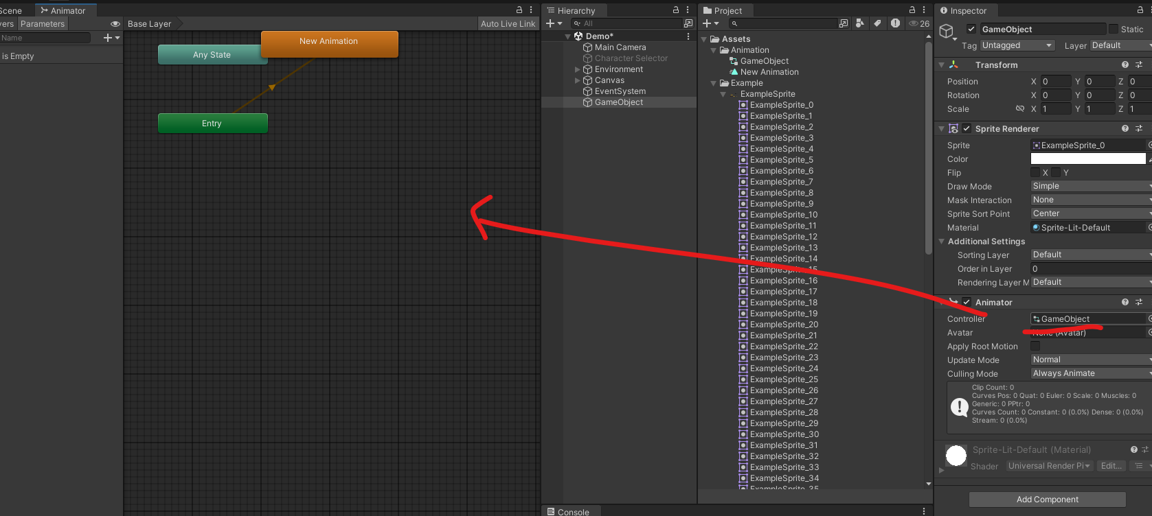 기존 에셋 폴더의 Animation, Sprite Example에 복붙하고 Animation Controller 생성