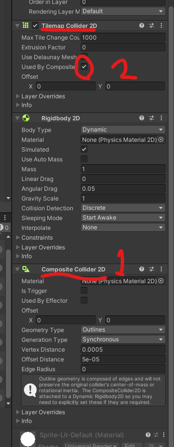 Composite Collider 2D 추가하고 Used By Composite 체크해서 충돌체를 하나로 합쳐주기