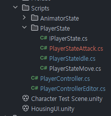 일단 사용할 State들만 먼저 아래처럼 생성하여 구현했다. Idle과 Move에서는 문제 없었는데 이제 콤보 공격을 구현해야하는 Attack에서 현재 살짝 막혔다. StateMachine으로 comboAttack 값을 1씩 올리는 느낌으로 구현하려고 했는데, 콤보 타이밍이 의도대로 동작하지 않는 느낌이 든다. 디버깅을 좀 더 해봐야겠지만 아무래도 애니메이션 transition 타이밍 등 다양한 요소가 고려되기 때문인 것 같다. 더 깔끔한 구현을 위해 애니메이션 이벤트 추가하는 방향도 고려해봐야 할 것 같다.