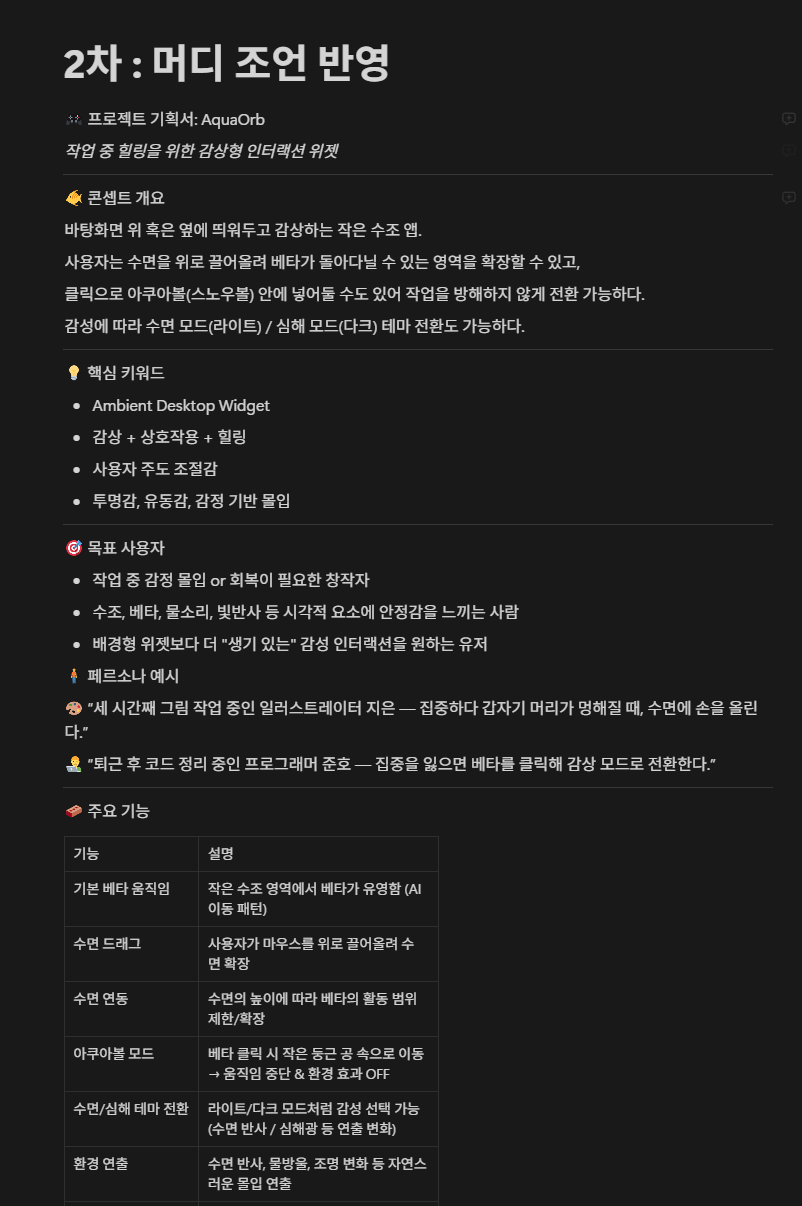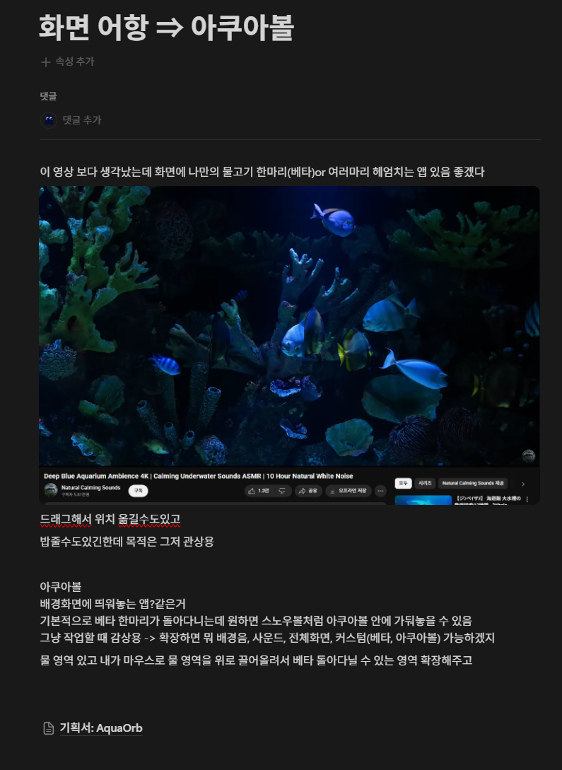난 현재 아이디어 수집 등을 notion에 기록하고 있다. AI랑 같이 기획서도 만들어보고 했는데 지금은 만들다 보니 내가 너무 무겁게 느끼는 것 같아, 좀 더 가벼운 느낌으로 접근하려고 프로토타입 만드는 느낌으로 진행하고 있다(기획서를 완벽히 따라가고 있진 않다)