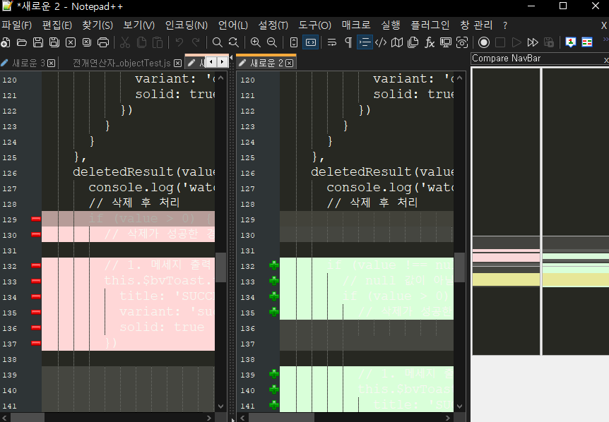 NotePad++의 plug-in(compare)을 사용하면 쉽게 두 파일의 비교가 가능하다.