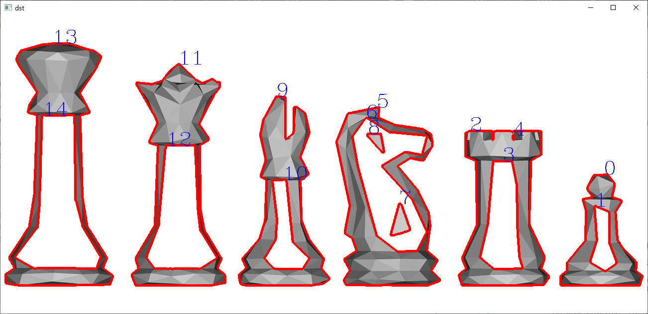 cv2.putText(dst, str(i), tuple(contours[i][0][0]), cv2.FONT_HERSHEY_COMPLEX, 1.3, (255, 0, 0), 1)